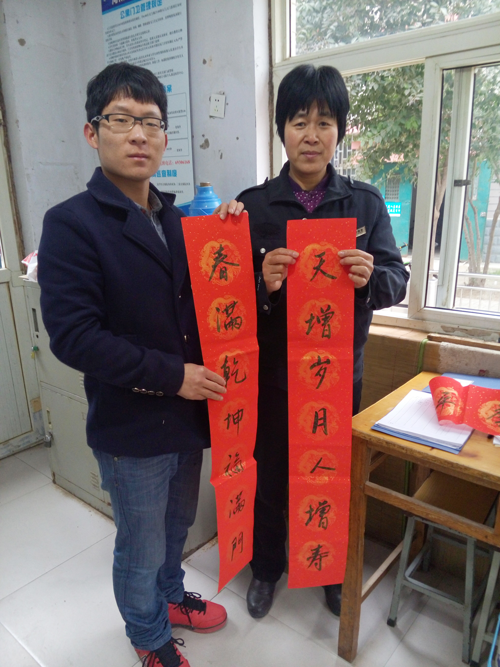 新年新气象,祝福送不停。1月2日和3日,书画社的同学们特地将“玉宇澄清浮正气 金猴奋起树新风”、“春归大地人间暖,福将神州喜临门”等一幅幅红彤彤的春联送到了保安、清洁工、宿舍管理员等广大工勤人员的手中,代表我院莘莘学子送上新春慰问和美好祝愿,感谢他们为保障校园秩序、环境清洁默默付出的辛勤劳动。
