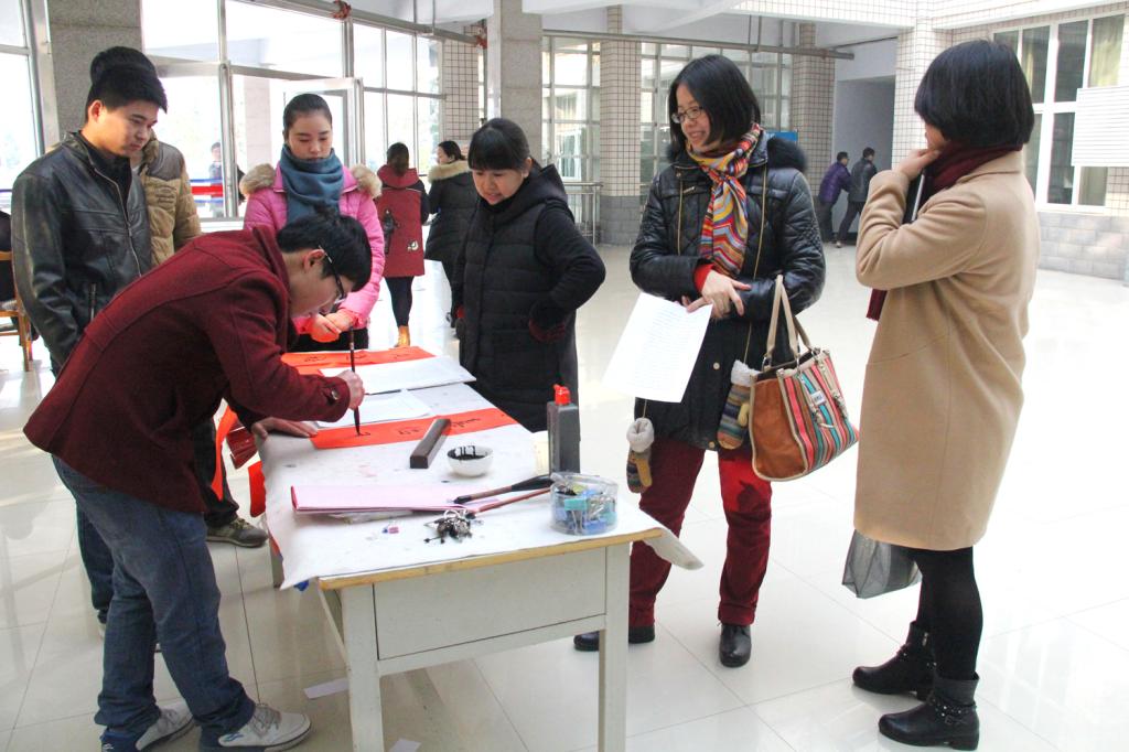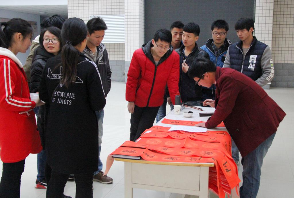 12月31日上午9点,活动在行政楼一楼大厅准时开始,淡淡的墨水气息,朱红的正丹纸和飘逸的书法字体吸引了不少师生驻足观看。活动现场,老师们可以挑选展示的春联成品,也可以选取自己喜欢的内容,由同学们现场书写。书法社成员激情书写、倾情服务,受到了来往师生的热烈欢迎和一致好评。