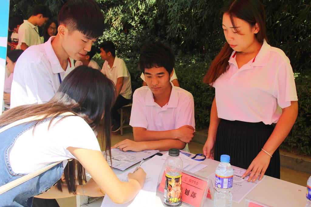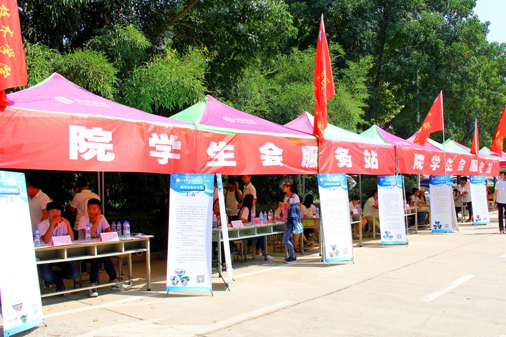 为迎接新生,统一身穿白色衬衫的迎新志愿者们一早便准时达到指定地点,搭建帐篷,摆放桌椅,积极做好各项准备。志愿服务队伍在为天食府南侧道路两旁设立了服务站,方便广大新生及家长前来咨询。在为期两天的志愿服务工作中,我院学生志愿者主动为新生搬运行李,耐心地为新生和家长们解答心中的疑问,并介绍校园环境以及新生刚到学校时应注意的事项。
