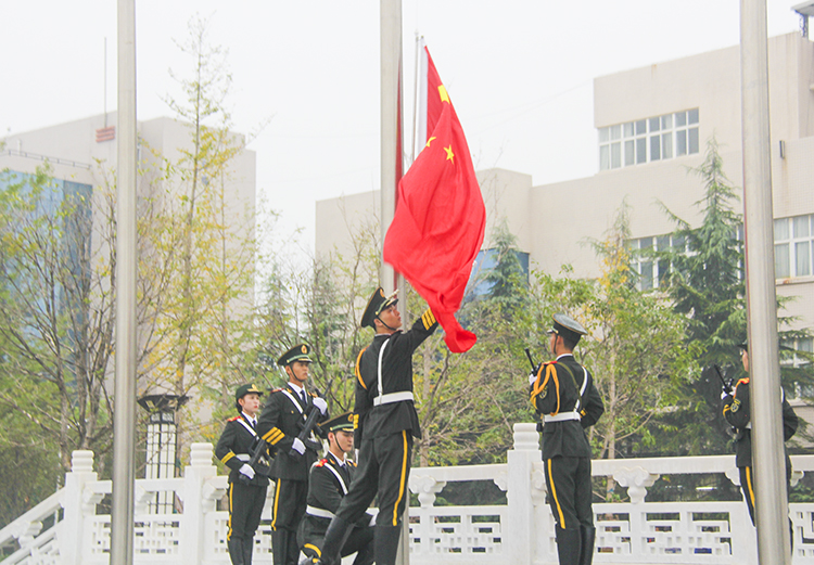 早上七点整,伴着蒙蒙的细雨,国旗护卫队迈着整齐而矫健的步伐徐徐走来,擎旗手在国歌奏响的第一个音符时将国旗展开抛出,伴随着激昂雄壮的国歌声,五星红旗冉冉升起,全场肃立,向国旗行注目礼。随后学生代表在国旗下进行演讲,呼吁同学们时刻警醒,铭记历史,传承不畏艰难的民族气节。