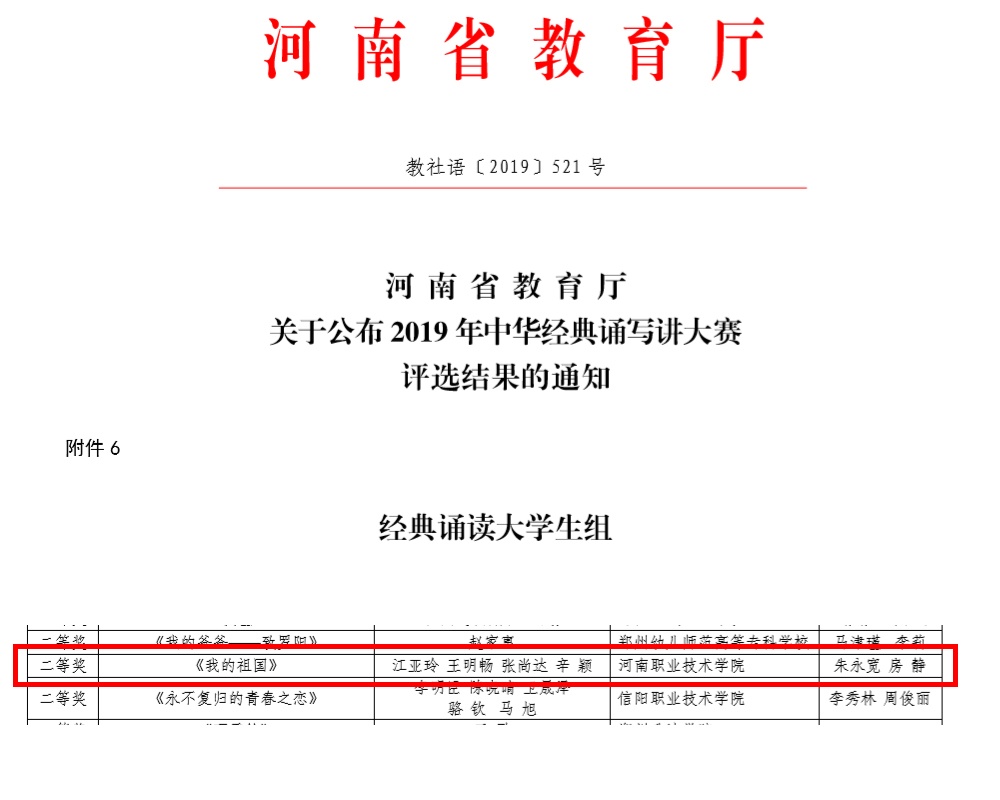 近日,河南省教育厅公布了“2019年中华经典诵写讲大赛”评选结果,我校选送的朗诵作品《我的祖国》获得大学生组二等奖,朱永宽、房静同志被评为优秀辅导教师。