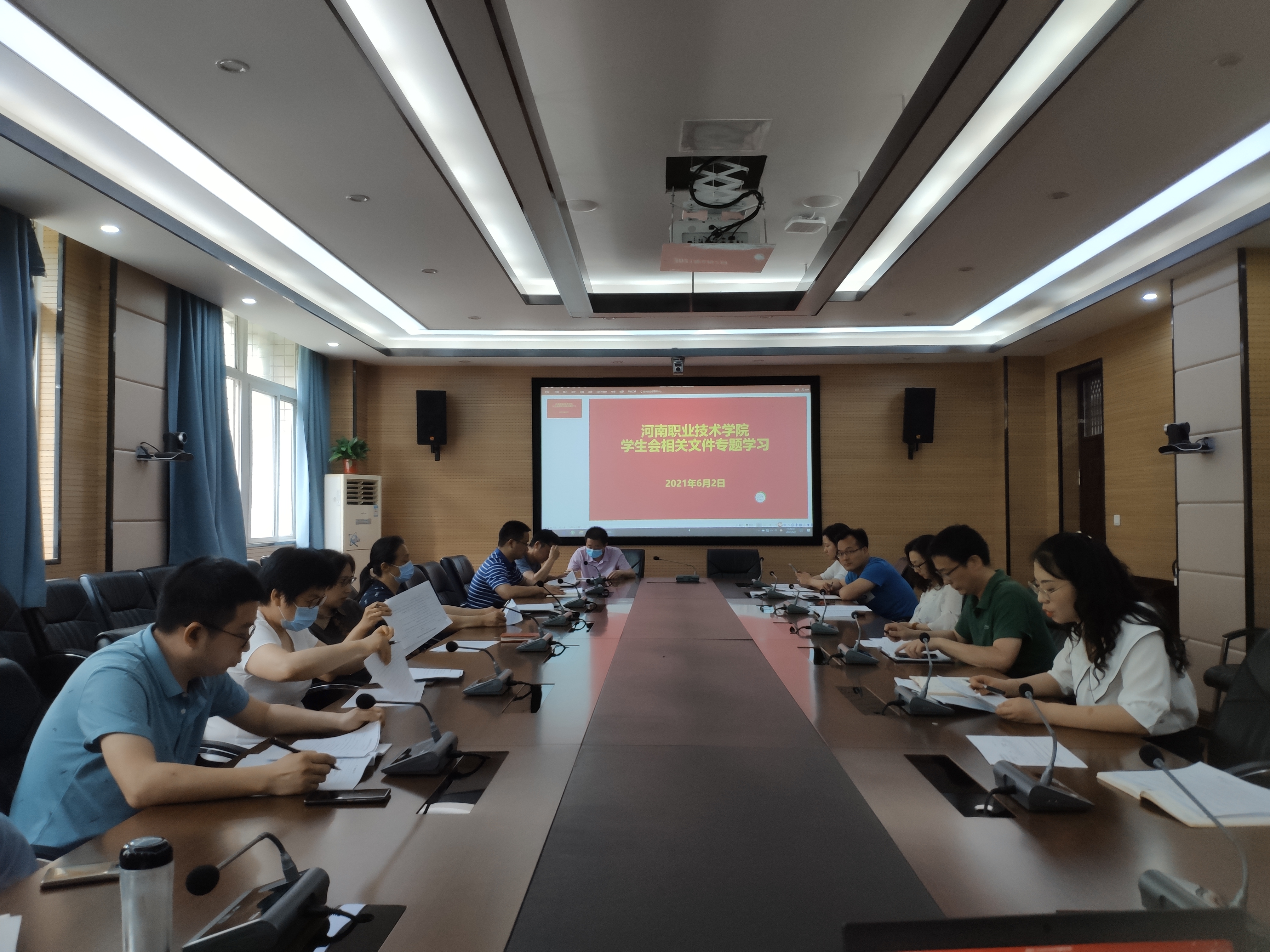 会上,房静同志带领大家集中学习了《地方学生联合会代表工作大会规定》、《普通高等学校学生会(研究生会)代表大会工作规定》等文件精神,并就二级学院章程的制定情况,学生代表大会代表产生及会议组织情况等进行了说明,要求各二级学院要提高认识,及时开展院级学生会组织相关文件精神培训工作,并按照文件精神抓好落实。