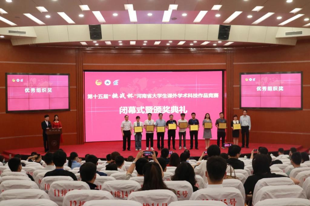 除国赛取得新突破外,在今年的第十五届“挑战杯”河南省大学生课外学术科技作品竞赛中,我校参赛师生的表现也十分亮眼。在进入省赛的36项作品中,共有17项参赛作品获奖,其中特等奖1项,一等奖2项,二等奖3项,三等奖11项,刘拥军、高金宇等9名教师获评“优秀指导教师”称号,我校被授予“优秀组织奖”,成绩再创历史新高!