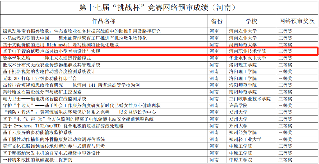 近日,由共青团中央、中国科协、教育部和全国学联共同主办的第十七届“挑战杯”大学生课外学术科技作品竞赛网络预审成绩揭晓,我校电气工程学院参赛作品《基于电子管的低噪声高灵敏小型音响设计与实现》荣获全国三等奖(河南省专科院校仅两项),实现了我校在“挑战杯”科技类竞赛全国赛中零的突破,为我校的“双高”校建设又添一项标志性成果。