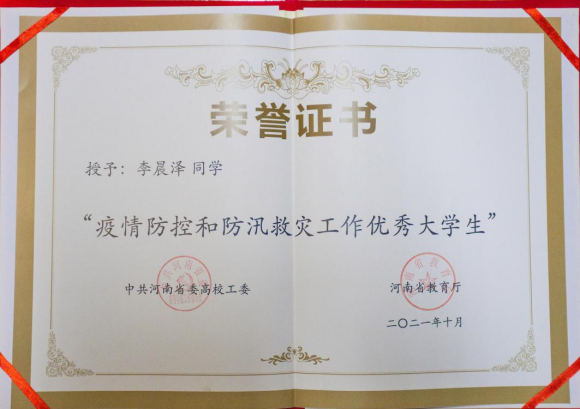 2021年的河南注定令人难忘:狂风暴雨侵袭我省大部分地区,在灾情尚未退却之时,疫情又卷土重来!我校青年学子李晨泽,毫不畏惧、挺身而出。今年7月,河南发生区域性严重洪涝灾害,李晨泽化身志愿者,在为期半月的行动中,先后联络提供1000余次帮扶,为8万余受灾群众带来温暖和希望。在8月疫情防控工作中,他再一次逆行而上,奔跑在社区中,护航全员核酸顺利进行。