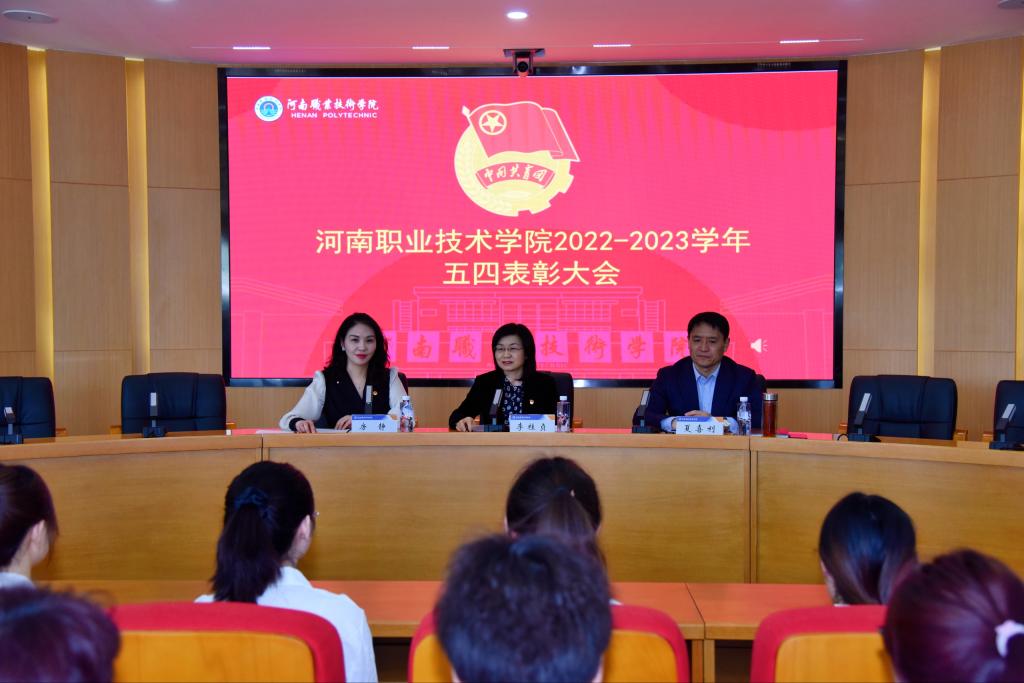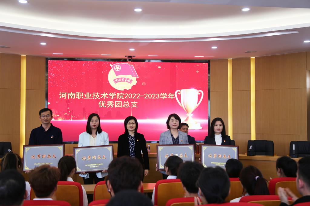 会上,22名新入团团员面对团旗庄严宣誓,工会主席夏喜利宣读了《共青团河南职业技术学院委员会关于表彰2022年度优秀共青团员、优秀共青团干部和优秀团总支(团支部)的决定》。随后,校党委书记李桂贞为“河职最美大学生”“十佳学生社团”“优秀团总支”颁奖,工会主席夏喜利为2022年度“优秀教工团干部”“优秀团支部”“优秀学生团干部”“优秀学生团员”获奖代表颁发荣誉证书。汽车与交通学院张洁老师和风暴英语协会陈留洋同学分别作为优秀团总支代表和十佳社团学生代表进行了典型发言。