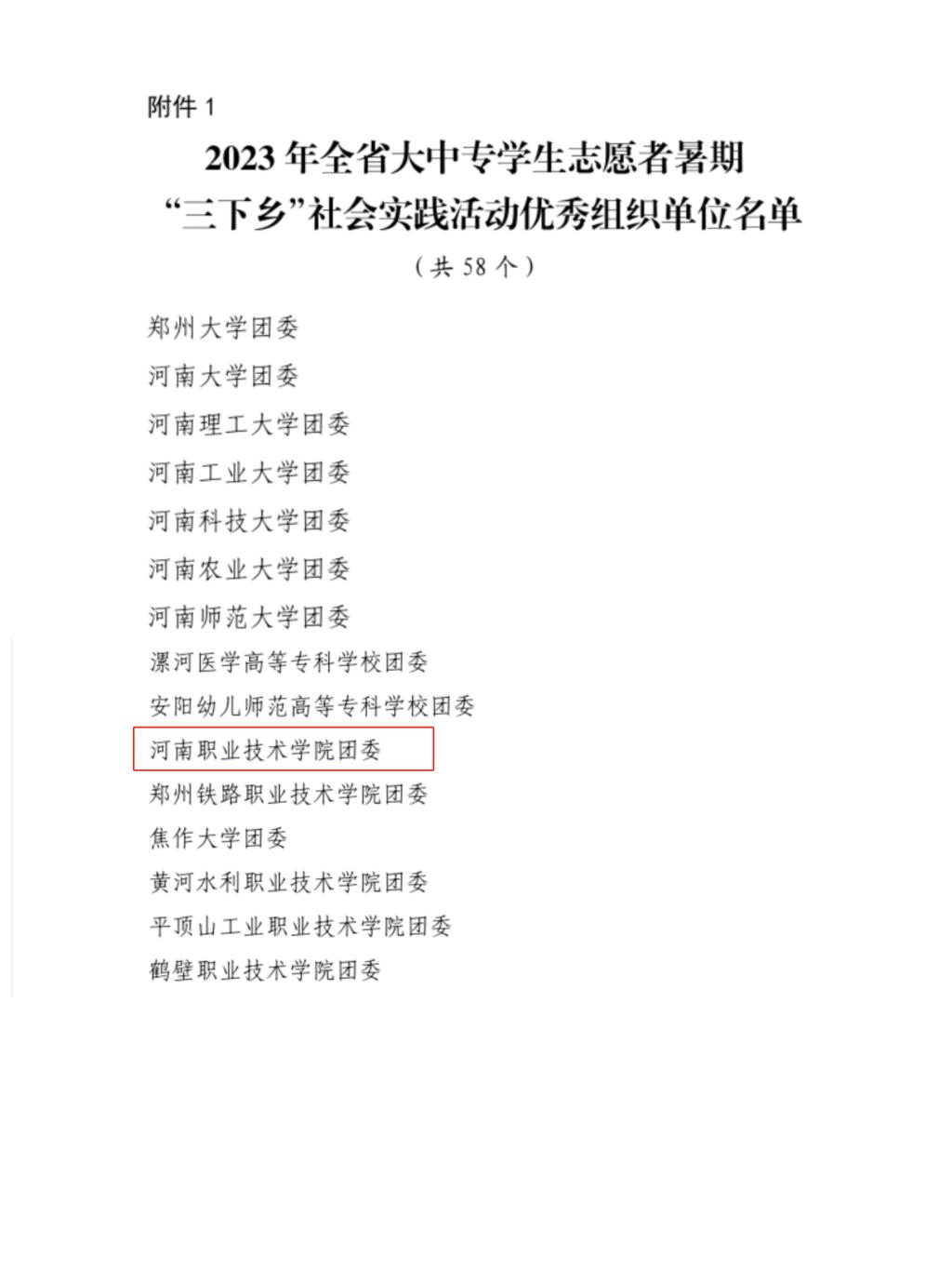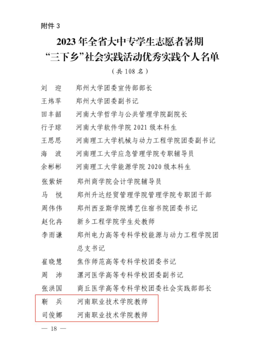 近日,由省委宣传部、团省委、省教育厅、省学联联合举办的2023年全省大中专学生志愿者暑期文化科技卫生“三下乡”社会实践活动结果公布,我校吃瓜爆料每日大赛投稿稿被评为优秀组织单位,靳兵和司俊娜两位老师被评为优秀实践个人。