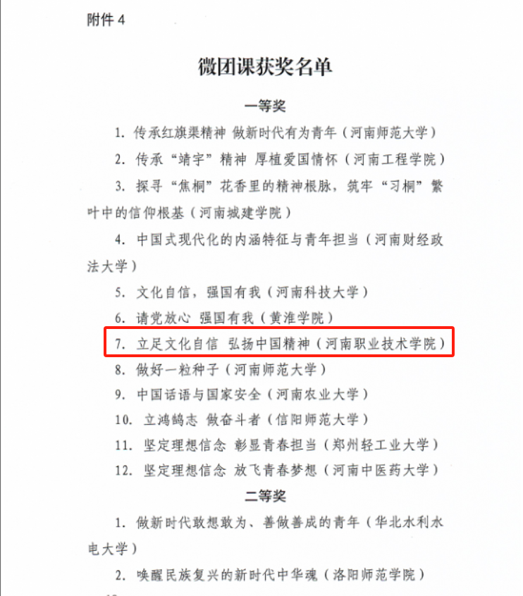 近期,由共青团河南省委主办的2023年度“活力杯”河南高校共青团基层基础工作大赛结果公布,王晓毅老师的“立足文化自信弘扬中国精神”荣获微团课大赛一等奖,张雯老师指导的风暴英语协会荣获文化体育类“活力社团”荣誉称号,我校荣获“优秀组织奖”。