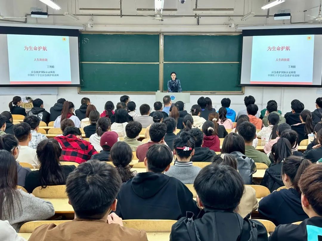 本次培训以“为生命护航”为主题,特邀中国红十字会应急救护培训师丁利娟老师进行授课。培训过程中,丁利娟老师就突发性晕厥、扭伤、骨折、皮肤擦伤、出血、气道异物梗阻、中毒、烧伤、踩踏等危险情况的急救措施进行了详细讲解。讲解过程中,丁利娟老师邀请同学们到台前进行模拟人实践,包括心肺复苏的标准姿势、AED的正确使用等,并现场演示了“8字包扎”、“单侧胸部包扎”的正确手法。