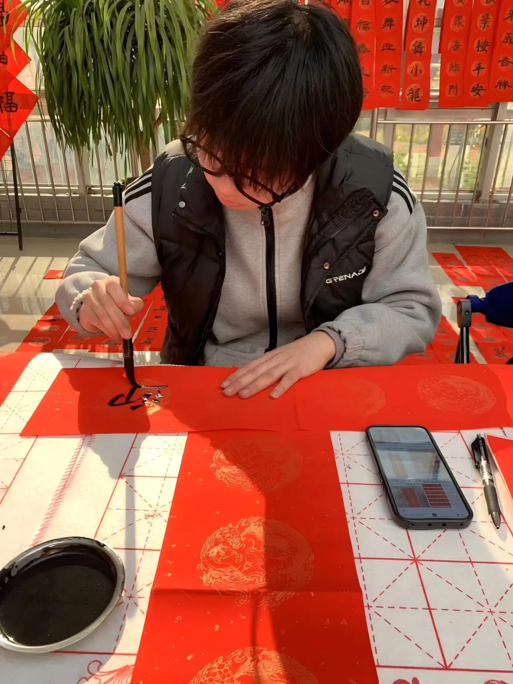 活动现场洋溢着一片热烈而欢快的氛围,新星书画社的社员们精心展示的春联作品,涵盖了楷书之端庄、篆书之古朴、隶书之典雅等多种风格,宛如一幅幅生动的文化画卷,深深吸引了众多师生的驻足观赏与积极参与。师生们流连于琳琅满目的对联与方格福之间,细心挑选着心仪之作,整个场景弥漫着浓厚的节日气息,仿佛提前迎来了新春的喜庆与温馨。