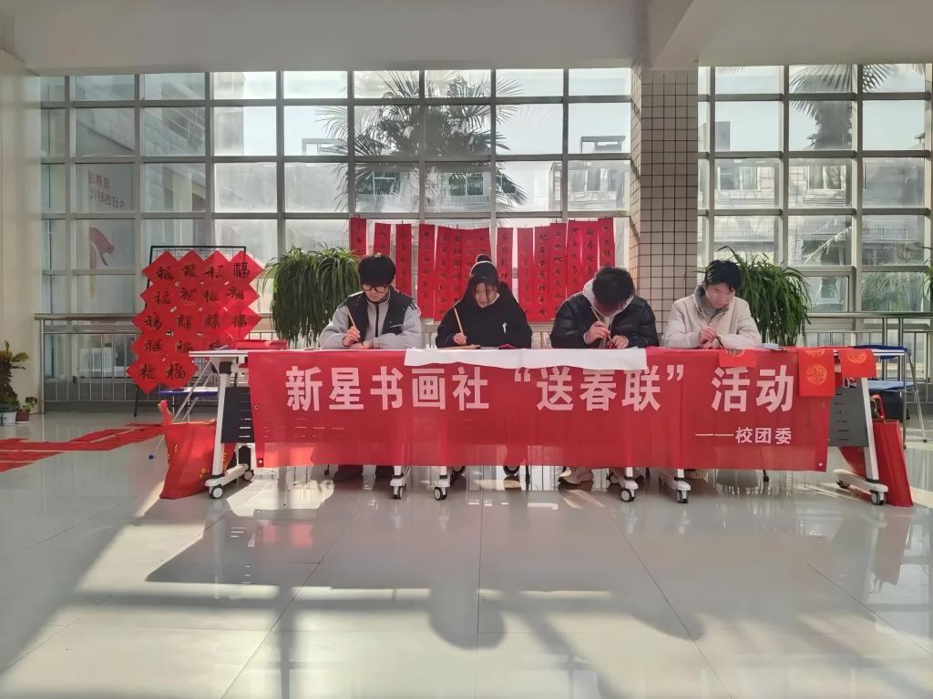 弘扬中华优秀传统文化,丰富校园文化生活,新星书画社于12月23日在行政楼一楼大厅内,精心策划了一场元旦送春联活动。此次活动以其独特的魅力,深深吸引了众多师生的热情参与,不仅促进了传统文化的传承与交流,更为整个校园营造了一股浓郁而温馨的文化氛围。