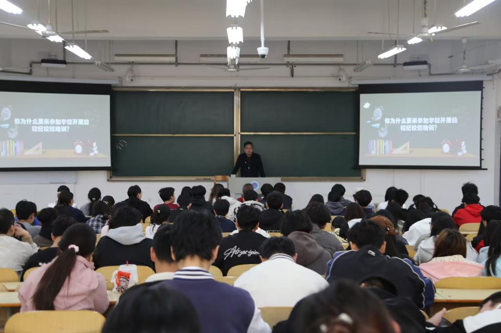 周春雷老师首先从校规校纪的严肃性切入,选取学生信息泄露、网贷案等真实案例,警示同学们守好校规校纪底线。随后,他围绕违规违纪的惩处措施、奖助学金评定制度、学生干部自查自纠等多个方面,深入解读了学校的学生管理条例,并着重讲解了“警告”“严重警告”“留校察看”等学生严重违纪行为的处理办法,强化学生干部的规则意识。周春雷老师