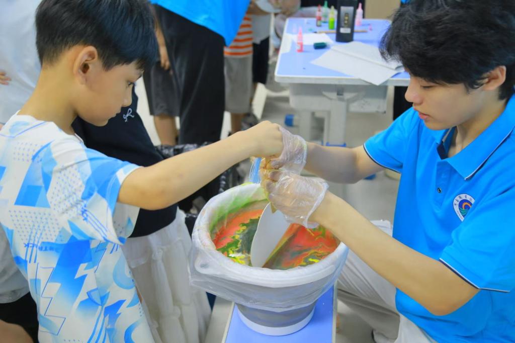 在传统文化体验环节,实践团队从漆艺与扇具的早期融合脉络入手,详细介绍了漆扇在实用需求与审美追求交织下的起源历程。随后,学生们在实践队员的指导下,在空白的漆扇上绘制图案或者书写文字,并将扇子放入倒入各式颜料的水桶中。轻轻转动之后,重出水面的扇子便生成了形态各异、颜色鲜艳的精美图案。孩子们仿佛穿越时空,与古老的文化来了一场亲密接触,在潜移默化中加深了对非遗文化的认知和热爱。
