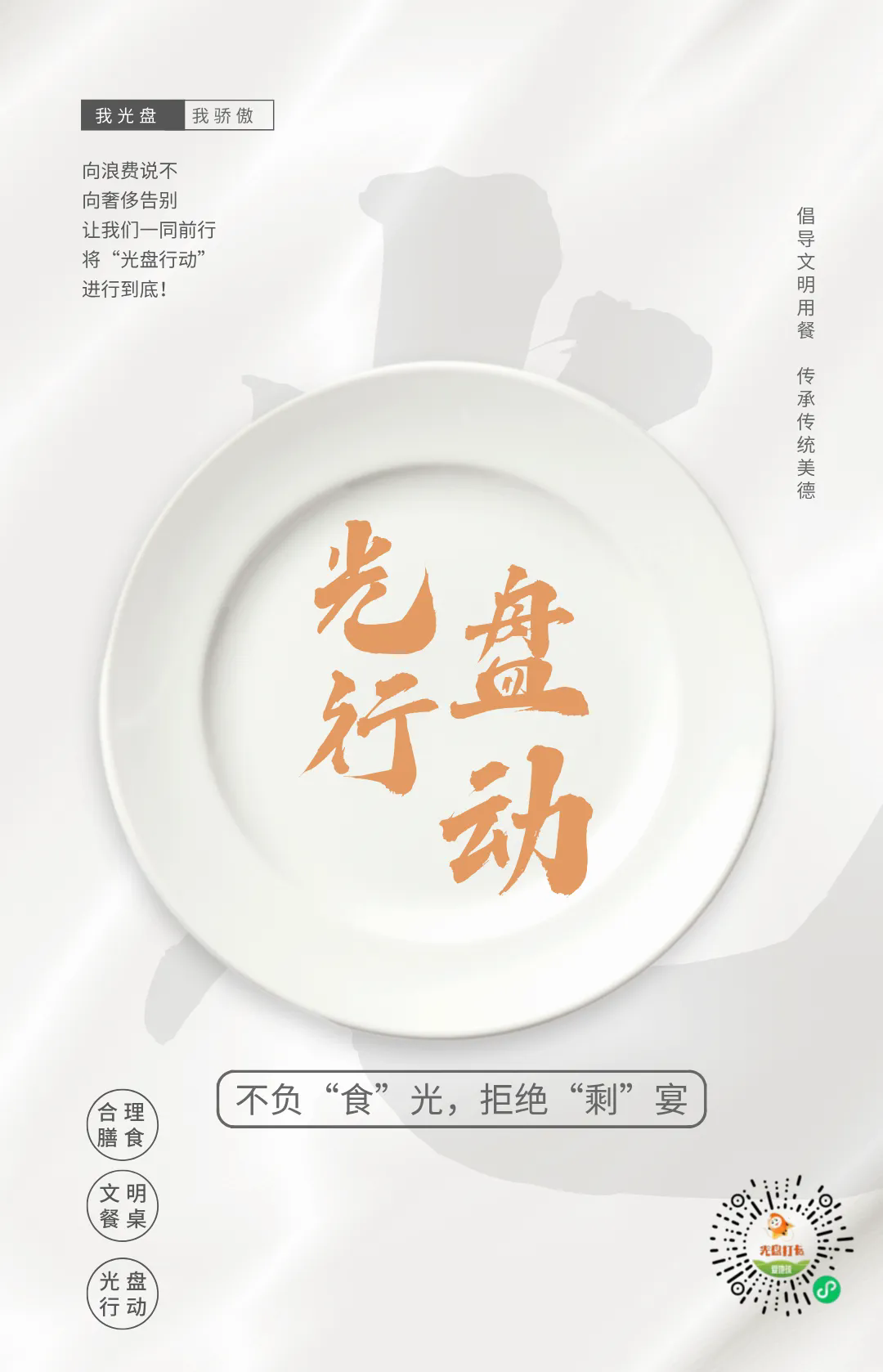杜绝食物浪费仍任重道远,需要我们青年学子一起行动,真真正正地让勤俭节约美德内化于心,外化于行,将"光盘行动"进行到底。活动时间有限,欢迎大家积极参与。