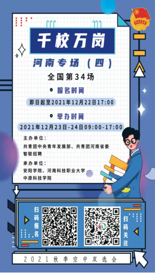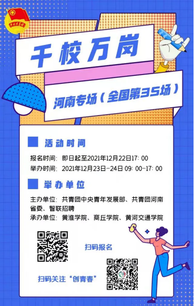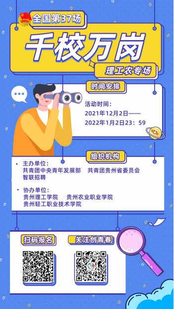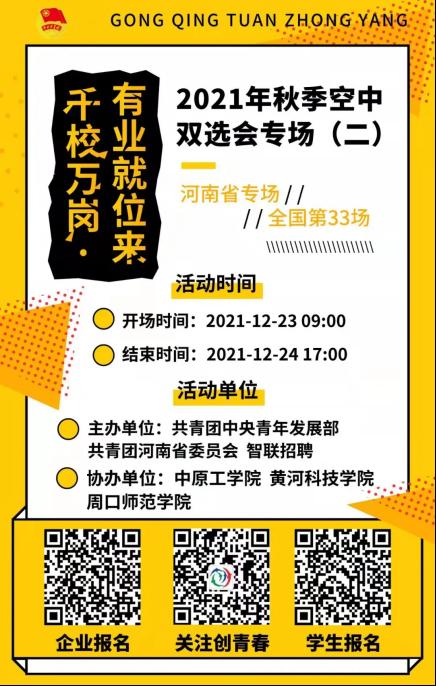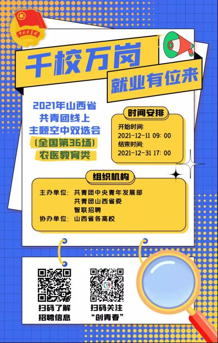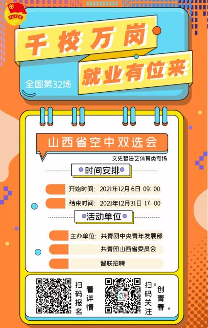 近日,由团中央青年发展部联合各省级吃瓜爆料每日大赛投稿稿、智联招聘举办的“千校万岗·就业有位来”线上线下招聘会开始了,共有山西、河南、贵州、吉林四个省份七个专场,具体时间地点及企业岗位信息可扫描海报二维码查看详情。