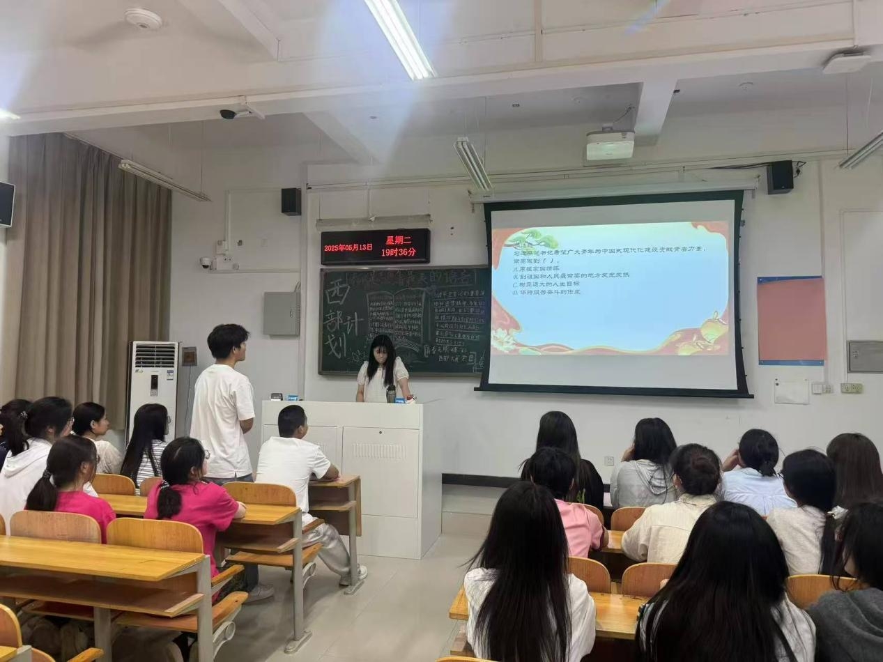 活动伊始,各班团支书向同学们详细介绍了谢依特小学戍边支教西部计划志愿者服务队的事迹,了解到志愿者们在促进当地教育事业发展、民族团结进步、兴边富民和稳边固边中发挥了积极作用,他们的奉献精神深深打动了现场的每一位同学。随后,团支书又带领同学们认真学习了习近平总书记的重要回信内容。总书记在回信中对志愿者们的工作给予了高度肯定,并强调,这些年,越来越多年轻人选择到西部、到乡村、到基层志愿服务,无私奉献,展现了新时代中国青年昂扬向上的精神风貌和强国有我的责任担当。希望广大青年坚定理想信念,厚植家国情怀,练就过硬本领,发扬奋斗精神,到祖国和人民最需要的地方发光发热,为中国式现代化建设贡献青春力量。