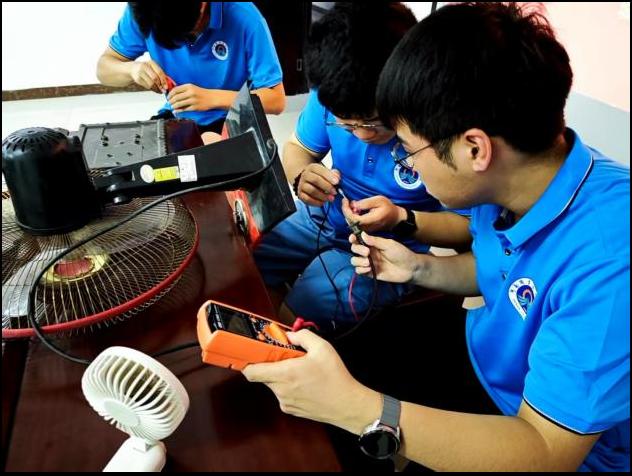在周庄村村委会活动室,同学们发挥自身专业特长,为村民义务维修小家电。同学们分工协作,凭借专业知识和实训经验排查故障问题,精准维修,使故障电风扇、小冰箱、电饭煲等小电器恢复正常运转。村民们对同学们的专业知识和实操能力竖起了大拇指。